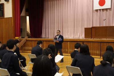 終業式では、今年を振り返り、来年へ向けた校長先生、生徒支援部長、進路指導部長からのお話がありました。